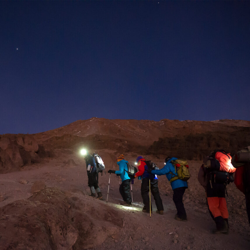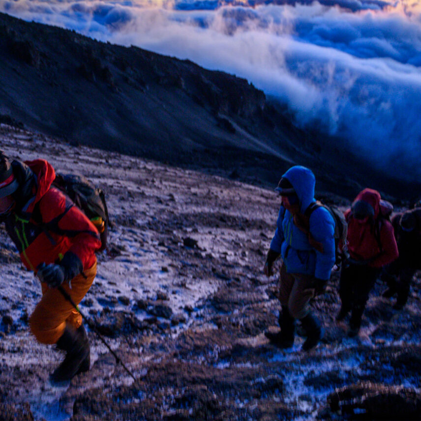Headlamps snaking up the mountain light your way during an overnight summit bid. Celebrate your success at Uhuru Peak (19,341′) with a few quick pictures at the top before trekking much of the way back down the mountain.