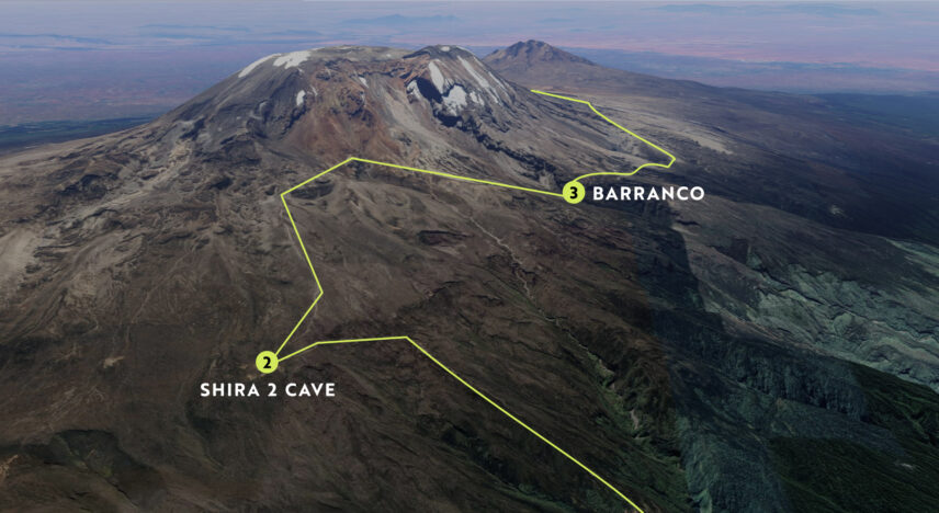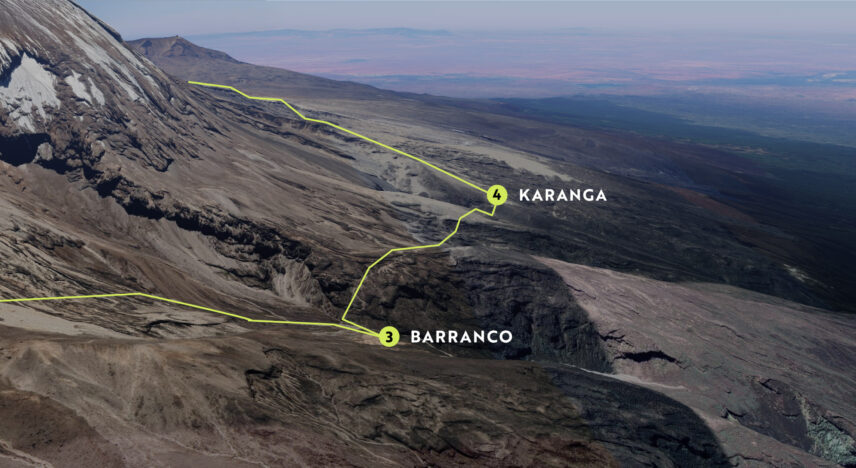A challenging scramble up the Barranco Wall is rewarded with breathtaking views from the top. Continue over ridges and valleys before a steep hike to camp.