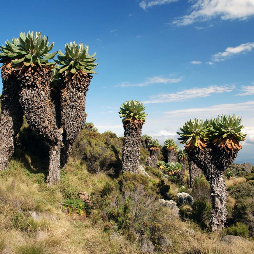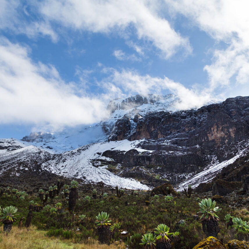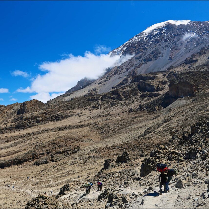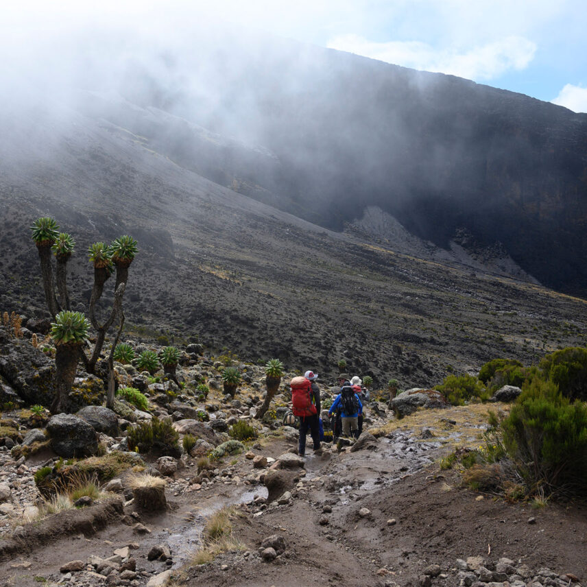 A steep rock scramble up the Barranco Wall brings you to the rolling ridges of Karanga Valley. Kilimanjaro’s famous glaciers loom in the distance.